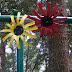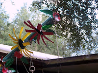 I have the hardest time growing flowers in my yard. Maybe it's the trees. I have lots of oak trees, big beautiful oak trees, that give shade and protect the house from the wind. The down side is there is a lot of shade, the ground is acidic, and the soil is poor. I've tried lots of plants, killed them really, no matter how much organic matter or water they get, they still die, so I got very excited when I found this book, Decorating Inside and Out from Leisure Arts, about tin can flowers. It is perfect for the recycler in me. I made them. They look whimsical and cute. All you need are tin and aluminum cans, tin snips, wire, paint, a hammer, 1 nail and paint.